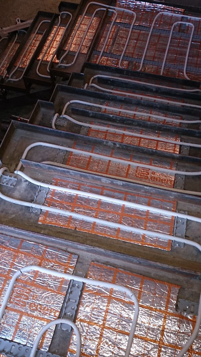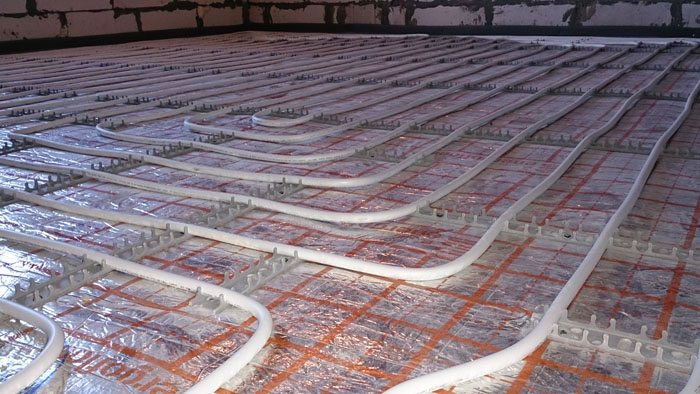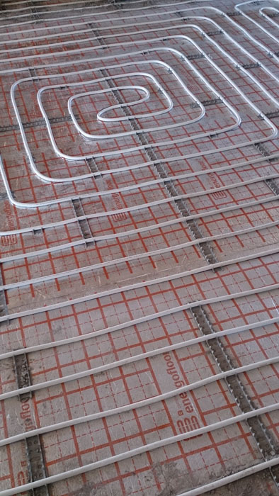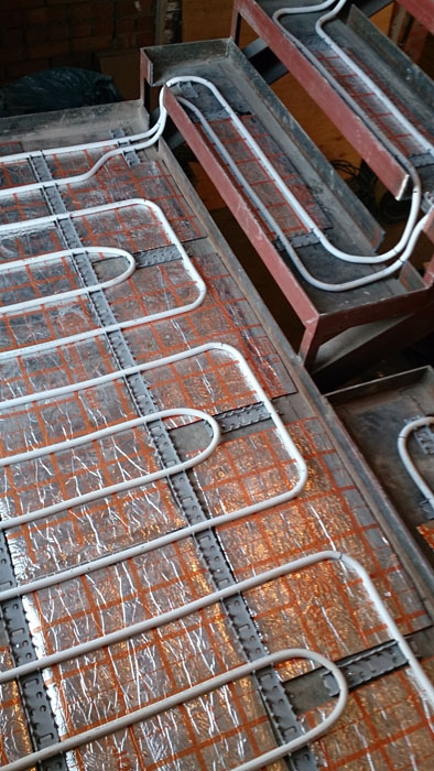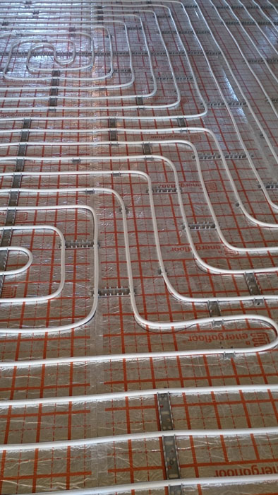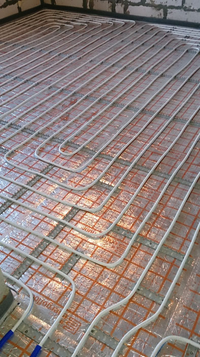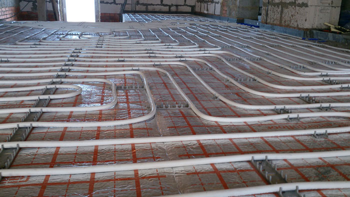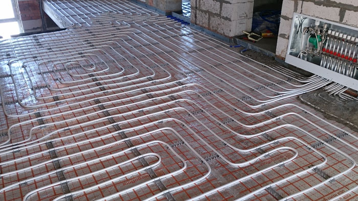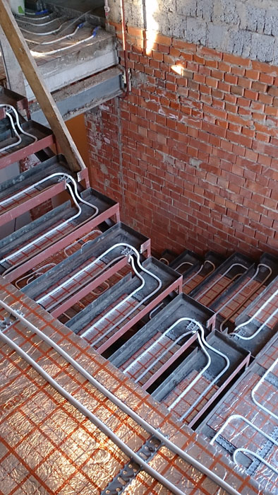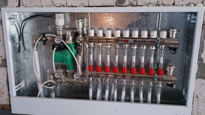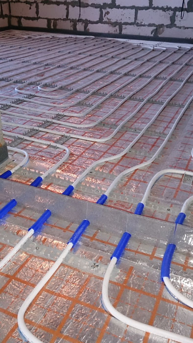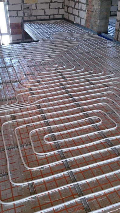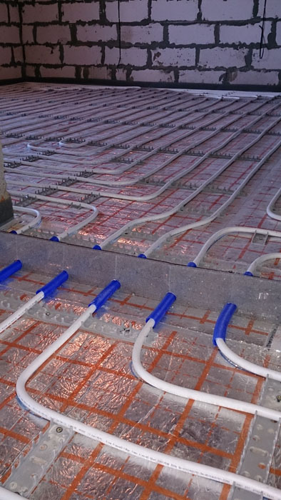 Собран на трубах и фитингах Henco Бельгия, теплые полы во всём доме, батарейное отопление реализовано лишь в гаражах и бане.