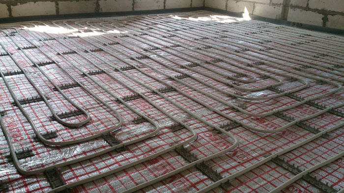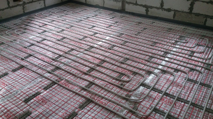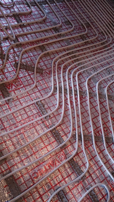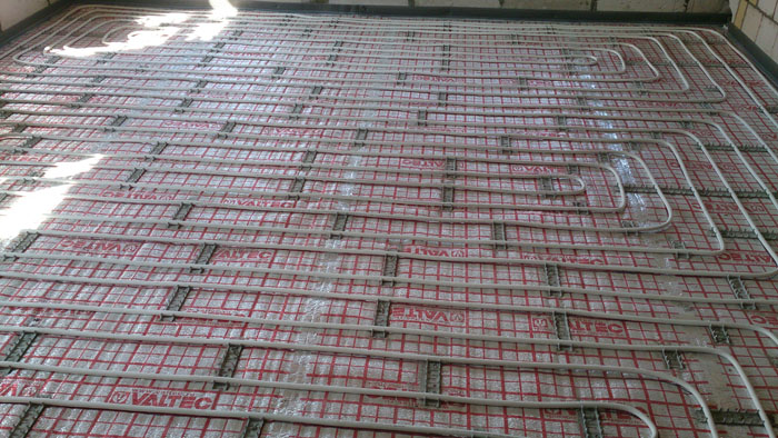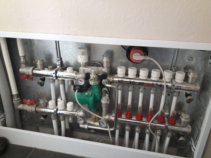 Отопление первого этажа пристройки - теплый пол, второй этаж и деревянный дом алюминиевые батареи.