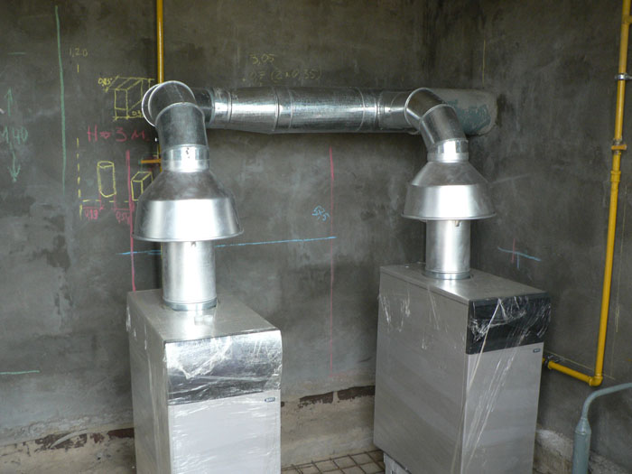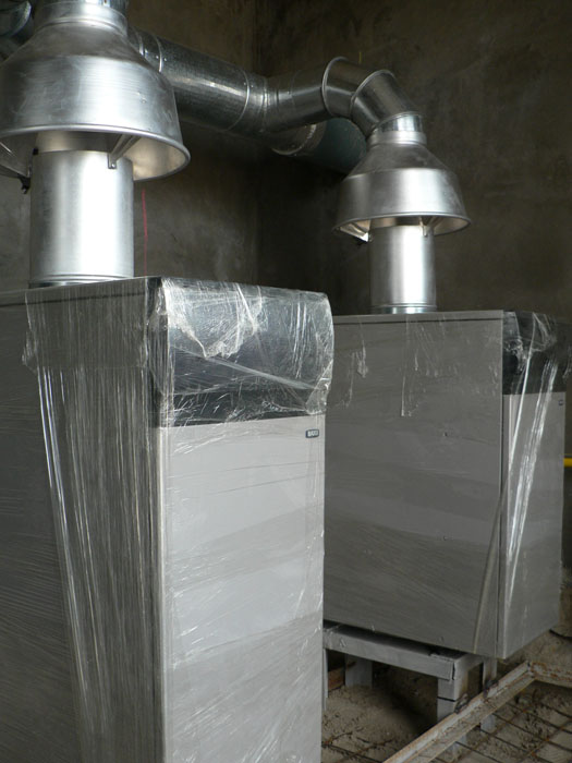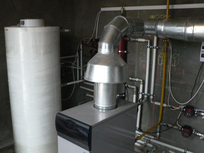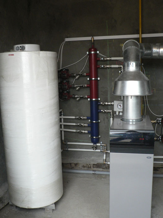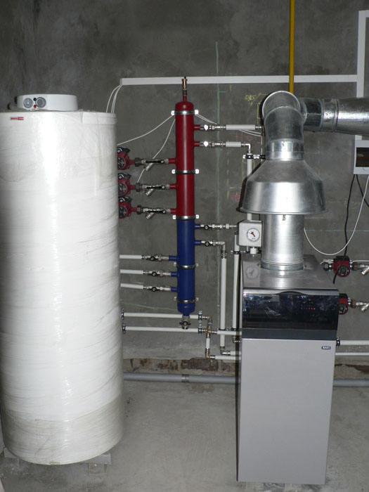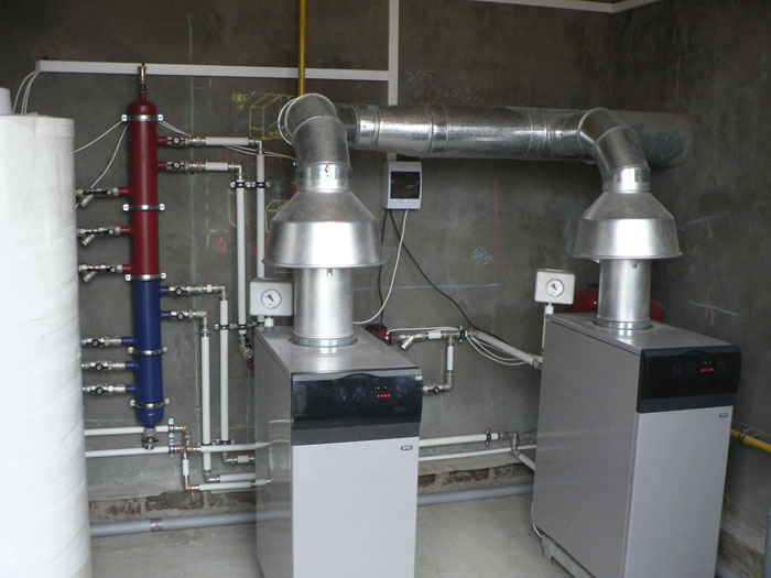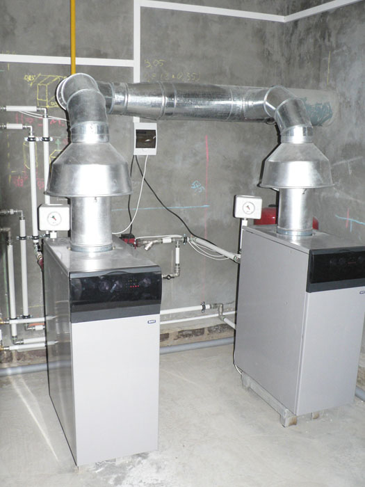Частный трех этажный дом 600 м2 площадью. Котельная собрана на двух котлах Baxi серии Slim по 40 кВт каждый. Так же установлена погодозависимая автоматика и бойлер косвенного нагрева Mora на 300 л.
