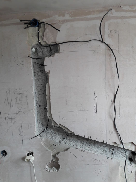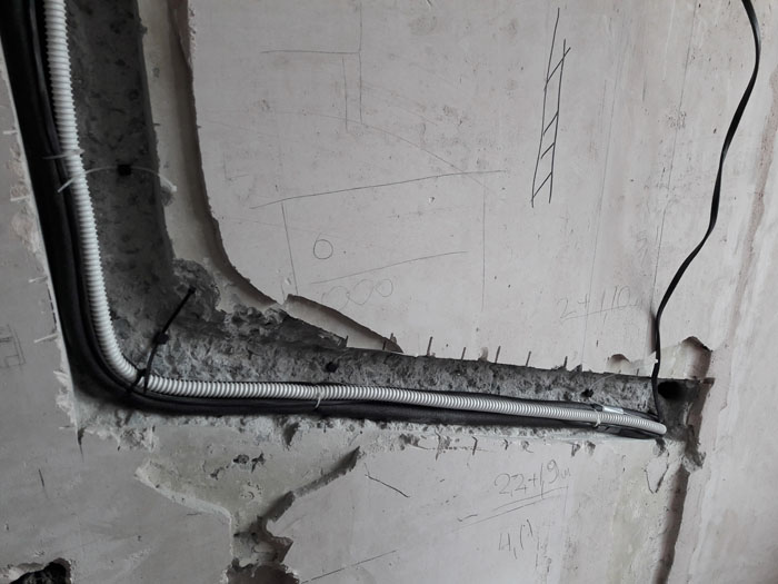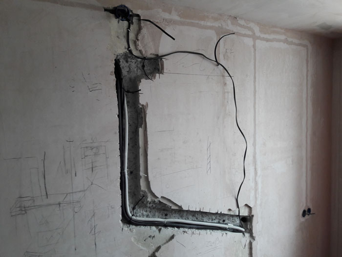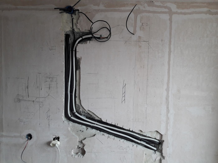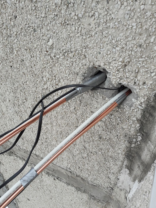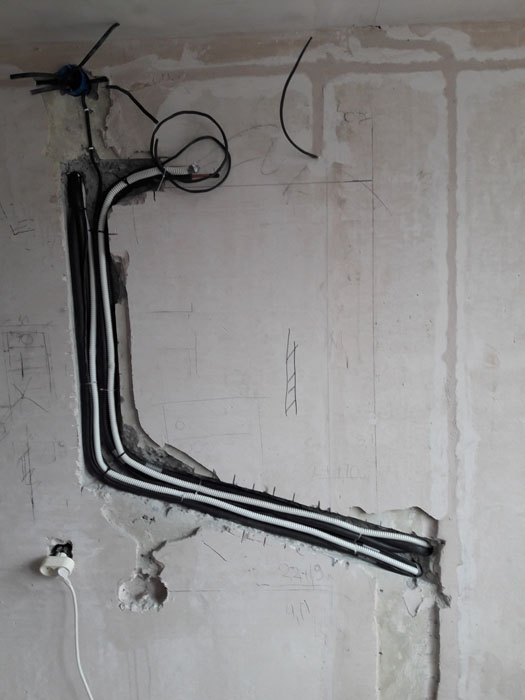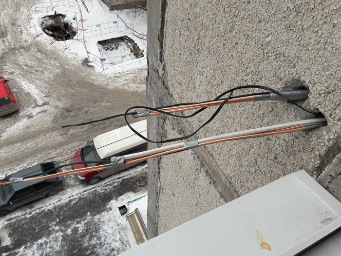 Монтаж трех кондиционеров. 2 шт. сделаны из кухни и зала в одной штробе, для меньших трудозатрат при монтаже и дальнейшей простоты обслуживания. Прокладка скрытая, в дальнейшем будут видны только сам блок кондиционера. Труб вообще видно не будет.